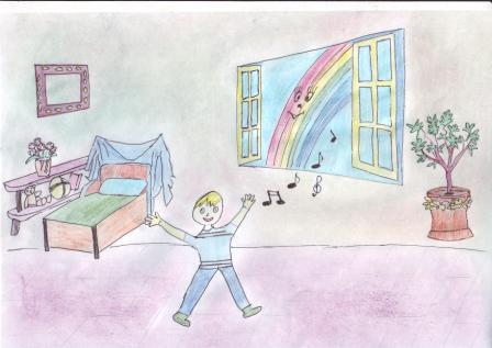 И вот лежал как - то раз Миша в своей постели, и было ему очень грустно. И вдобавок к этому на улице пошел еще и хмурый дождь. Мише стало совсем невмоготу. Тогда-то он и вспомнил о своей особенной книге, и решил, что, пожалуй, настал тот момент, когда нужно воспользоваться волшебной книгой бабушки. Миша достал ее, отер накопившуюся пыль и стал читать. С начало не происходило ничего особенного. Но вдруг за окном на улице, среди мрачного дождя, засветило яркое солнышко, и на небе появилась огромная, красивая радуга! Миша смотрел на нее завороженными глазами! И тут случилось чудо, радуга обратилась к Мише прямо человеческими словами: «Миша, прикоснись пальцами к моим волшебным струнам». Миша, преодолев свою боль, протянул к радуге руки. Удивительно, но радуга оказалась совсем рядом. И как только Мишины руки коснулись первого цвета, вдруг зазвучала чудесная, красивая музыка! Она лилась и лилась, словно звонкий ручеек. Такой музыки Миша еще никогда не слышал. Вся комната Миши наполнилась этой музыкой. И вдруг, о чудо! Миша вскочил на ноги и стал танцевать! Мальчик был счастлив, но чего-то ему все-таки не хватало. Тогда он решил прикоснуться к другой струне радуги, потом к третьей, к четвертой и так ко всем остальным. И когда он прикоснулся ко всем цветам-струнам радуги, с нее полились разноцветные волшебные капельки, которые как только касались земли, превращались в веселых девочек и мальчиков. Они сразу же становились Мишиными друзьями. А ведь именно этого ему так сильно не хватало. Счастью Мишиному не было предела! А Радуга смотрела на него и улыбалась, ведь для нее было радостью - приносить людям добро!