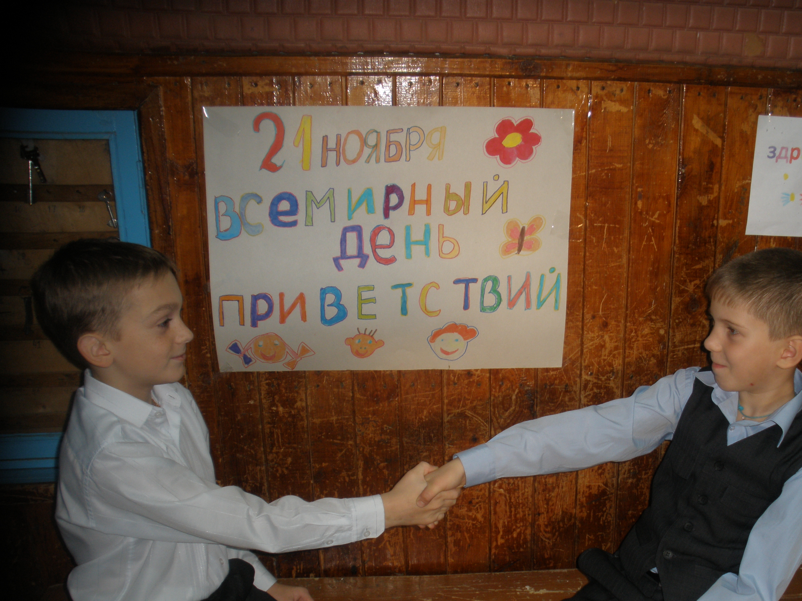 21 ноября наша команда "Этикешки-Ухта" отметила праздник - День приветствия! Нам хотелось, чтобы не только мы, но и все дети узнали об этом замечательном празднике. Поэтому сначала мы раздали одноклассникам красочную "Первоклассную газету" со статьями о приветствиях в разных странах мира и истории зарождения приветствий. А чтобы нашим друзьям было интересно, мы еще и рассказали о необычных приветствиях. Всем очень понравилось! Но нам хотелось , чтобы не только наши одноклассники, но и вся гимназия узнала об этом празднике! Поэтому мы поставили цель, что каждый из "Этикешек" должен поздороваться как минимум с десятью ребятами. И нам это удалось! Было очень приятно, когда незнакомый человек в ответ на приветствие отвечает и радостно улыбается! Нам очень запомнился этот праздник, мы поняли как это важно когда ты вежлив . Ведь если все люди будут здороваться друг с другом, мы все будем, как будто немножко друзья и на Земле не будет войн и ссор!