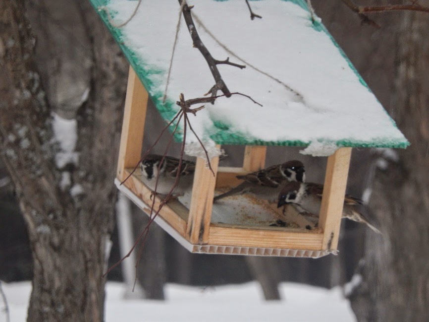 Птичек мы подкармливаем крошками хлеба и семенами подсолнечника. На фотографии - воробей! К кормушке часто прилетают воробьяи и голуби!