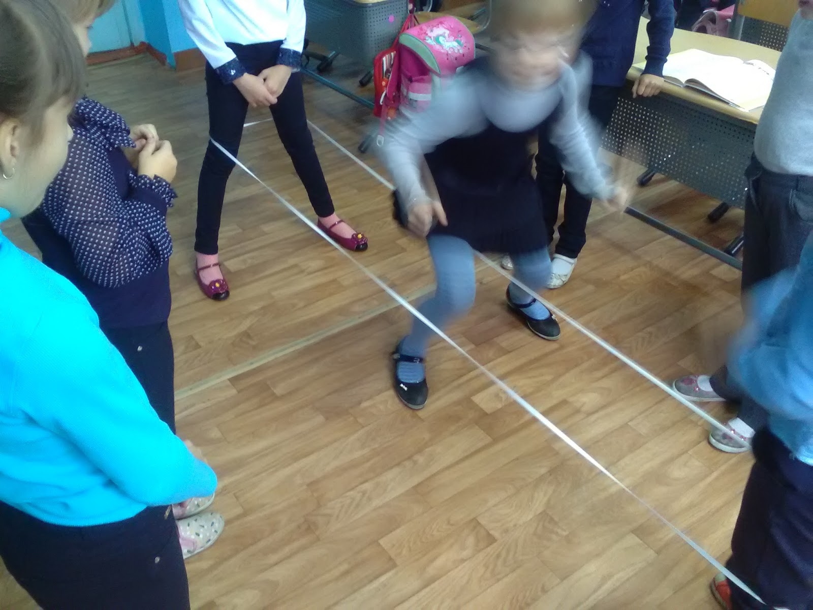 Играть могут 3 человека или больше. Резинка натягивается между ног двух игроков, третий прыгает. Постепенно уровень резиночки меняется. Если ребенок задевает резиночку, то игрок меняется.