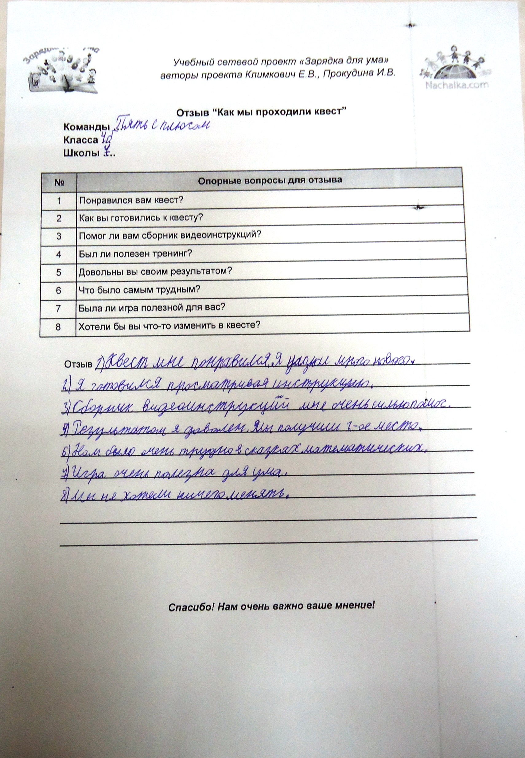 Наш квест "А ну-ка, посчитай!" прошел очень хорошо. Всем участникам было очень интересно. Нас удивило и порадовало то, что в задания были включены QR-коды, по которым мы выходили на игру и играли! Нам было не трудно, а очень даже интересно играть, потому что мы до этого узнали много разных способов быстрого счетв. В ролях Тренера и Мастера быть нам очень понравилось. Трудности небольшие были, но мы помогали друг другу их преодолеть! Большое спасибо за то, что мы поучаствовали в проекте. Проект нам очень понравился и мы точно приблизились к совершенству!