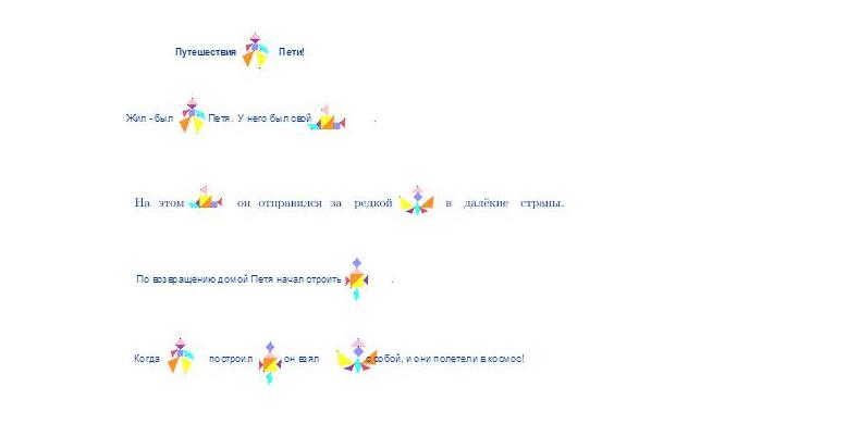 Ср, 2019-12-04 05:55 — Арина2009Здравствуйте, ребята! У нас был конкурс "создай свою фигуру из танграма". Мы определили лучшие работы, а потом придумали рассказ с этими предметами.